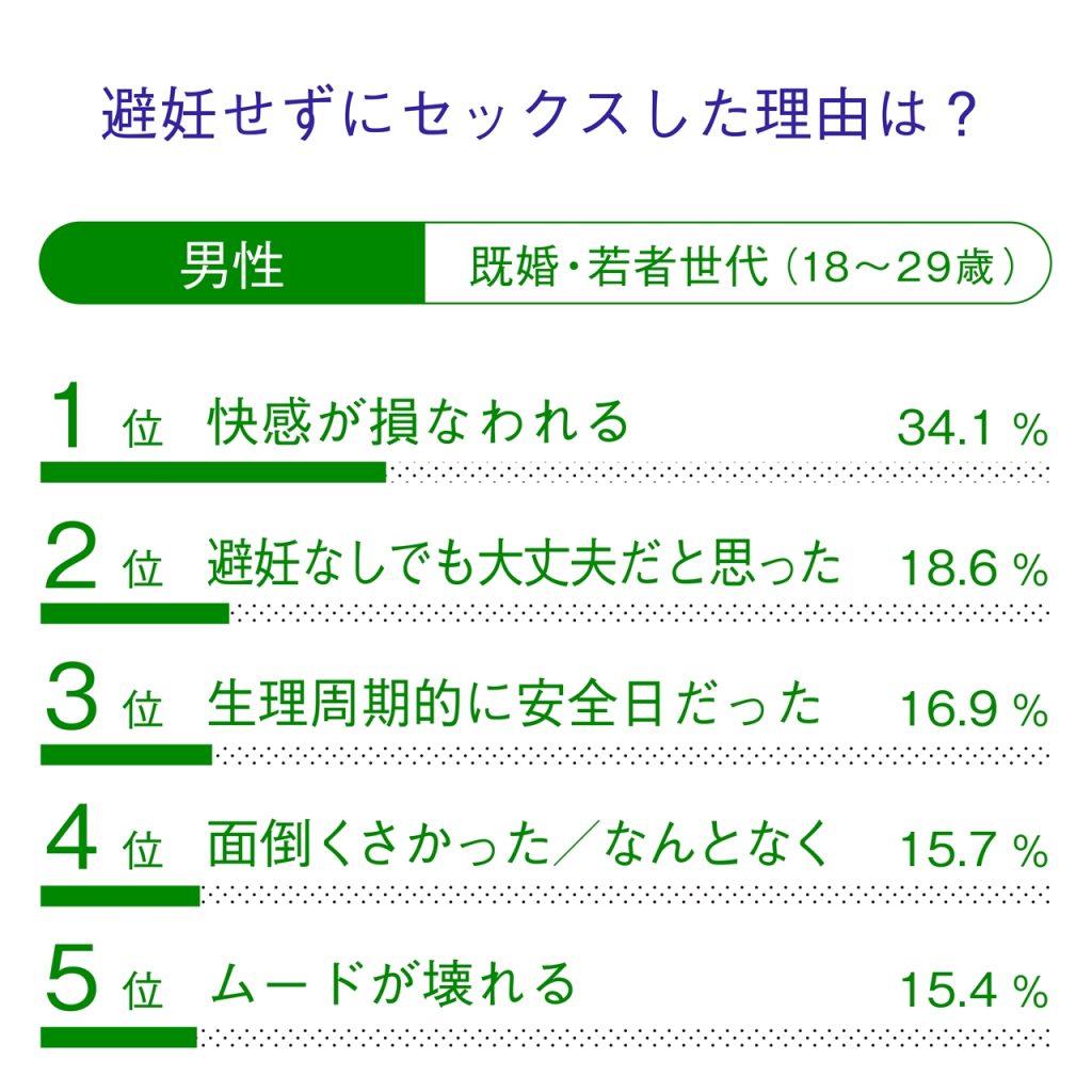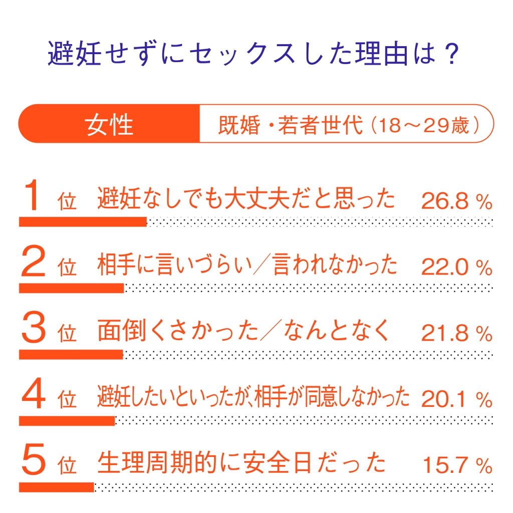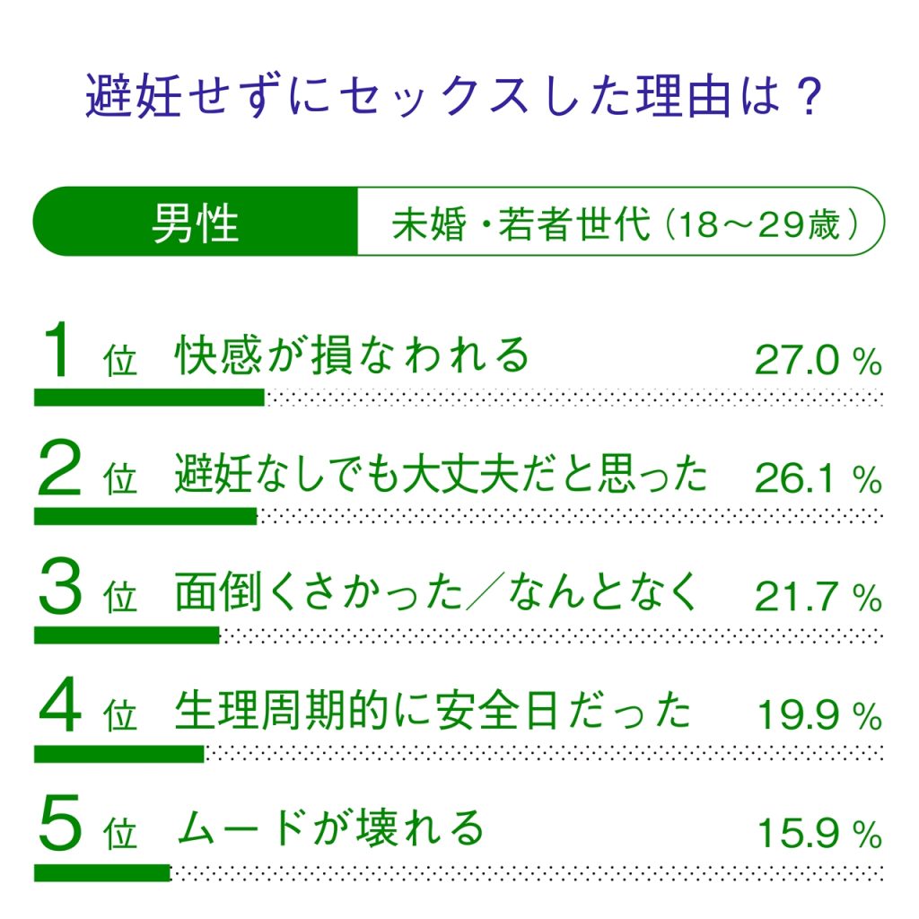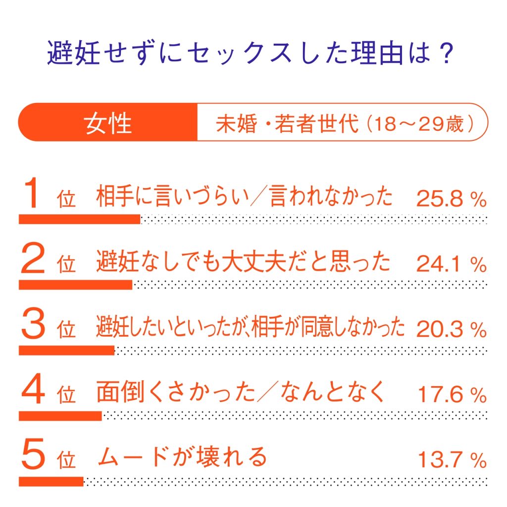 - 若者の2割、大人の4割が、妊娠を望まないセックスで「避妊しなかった経験がある」と回答。その理由は、若者では「避妊なしでも大丈夫だと思った」、「快感が損なわれる」が上位だった。