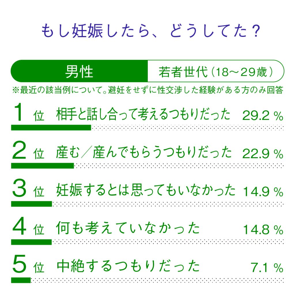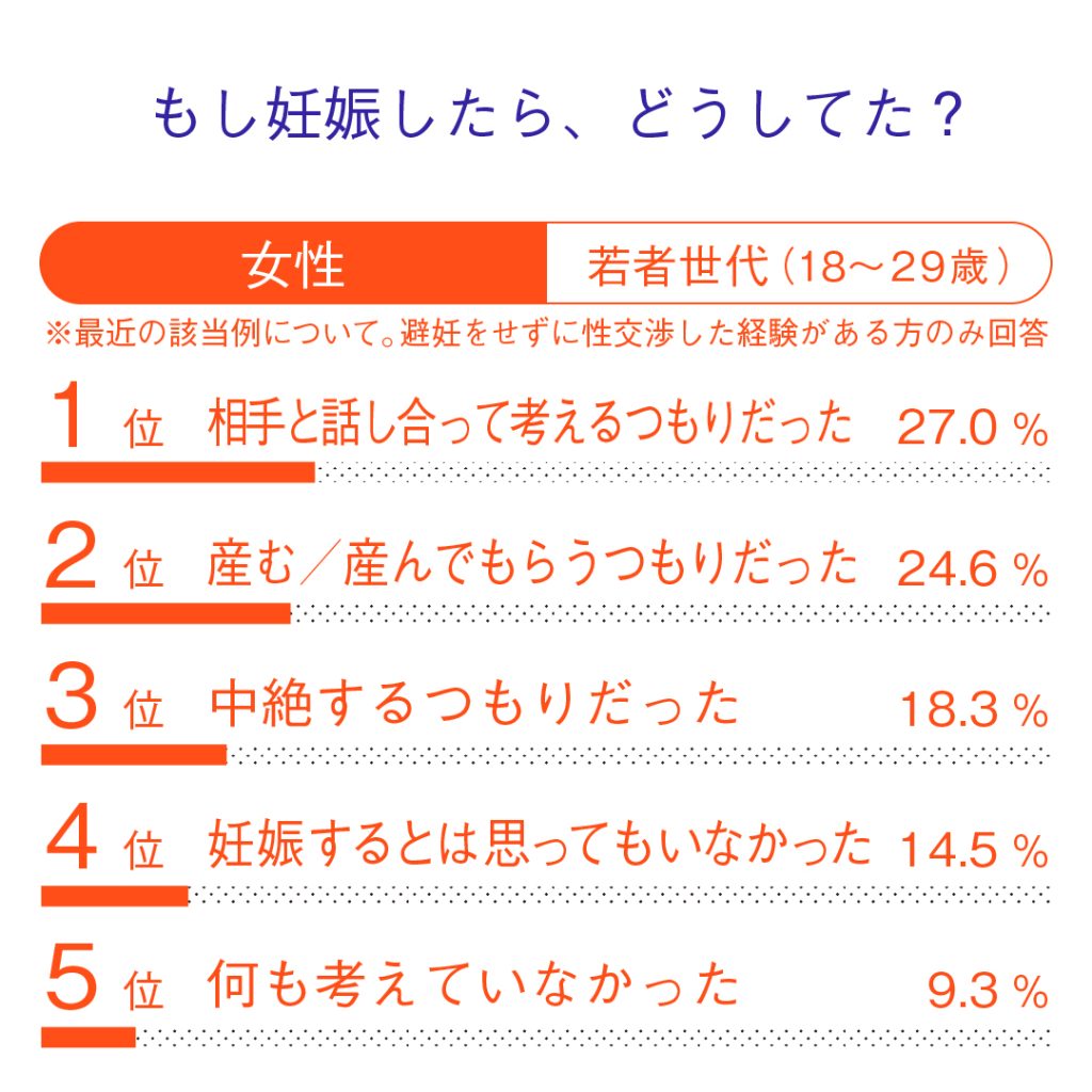 - 若者の2割、大人の4割が、妊娠を望まないセックスで「避妊しなかった経験がある」と回答。その理由は、若者では「避妊なしでも大丈夫だと思った」、「快感が損なわれる」が上位だった。