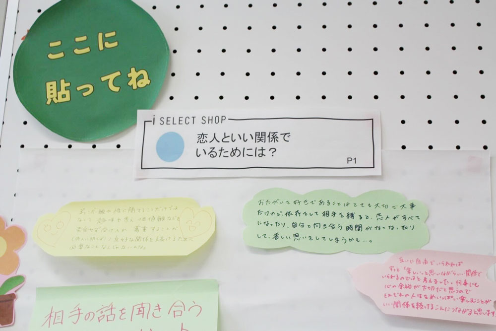 ピアの活動で4年間続けている学園祭の出展では、毎年友人や訪れた保護者の方や受験生に「SRHRについて考える展示・ワークショップ」を開催しています。2年目の展示では、「パートナーを大切にするには、何を意識したい?」などの質問を掲示し、参加者にその答えを付箋紙に書いて貼ってもらう参加型展示を企画しました。「相手の立場になって考える」「依存しない距離感」などのたくさんの意見が集まりました。