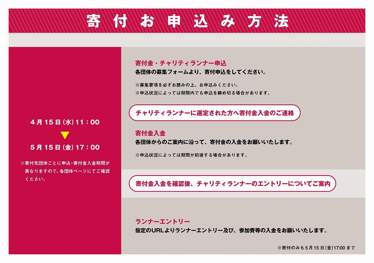 ※1.寄付金・ランナー申し込み、2.寄付金入金、3.ランナーエントリーを全て15日17時までに完了をお願いします。