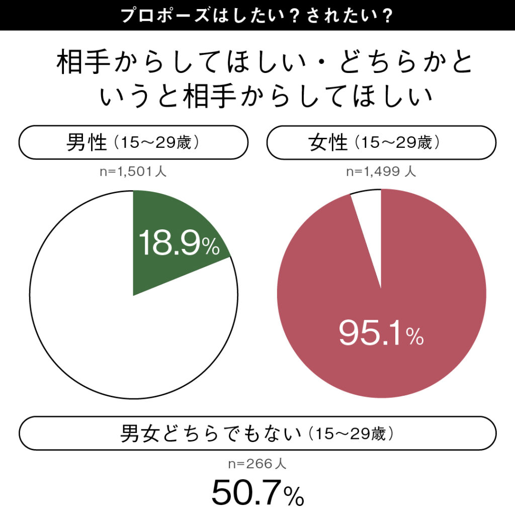 「プロポーズはしたいですか・されたいですか。」という質問に対して、「相手からしてほしい/どちらかというと相手からしてほしい」と答えた若者男性(15-29歳)は18.9%、大人男性(30-64歳)は8.4%なのに対し、若者女性は95.1%、大人女性は89.2%という結果となり、プロポーズは「男性から女性」というステレオタイプが見られました 。