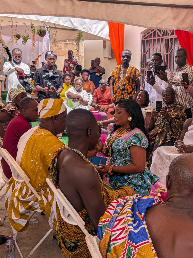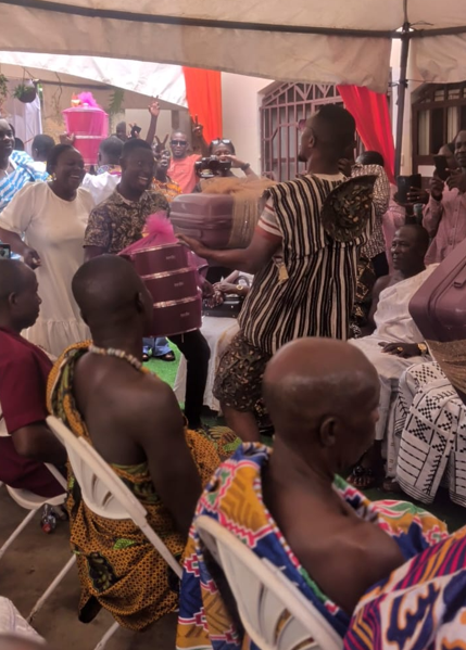 まず行われたのがTraditional wedding(伝統的な結婚式)。ガーナでは新婦の家に新郎の家族がやってきて、両家の顔合わせのような意味があります。新郎はアシャンティ(クマシ)の出身ですが、ドリーンがクロボ出身なので、Traditional weddingはクロボスタイルで行われます。ドリーンの家族のお家の敷地内にテントが張られ、向かって右が新郎側、左が新婦側、その周りに参列者が座ります。