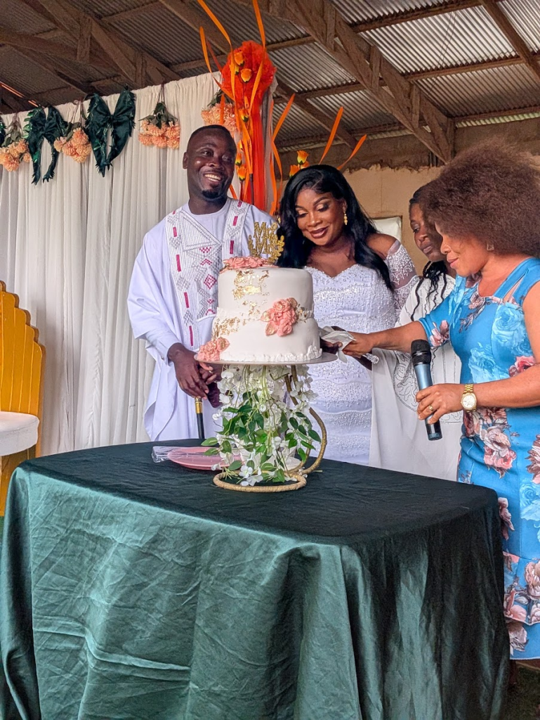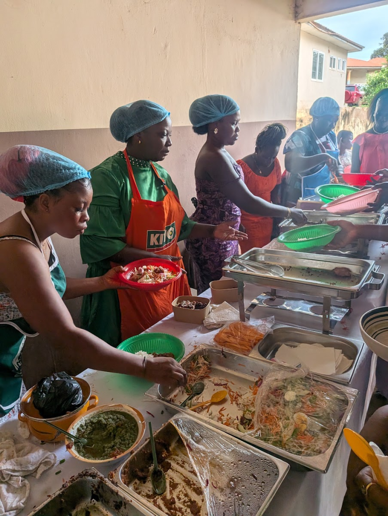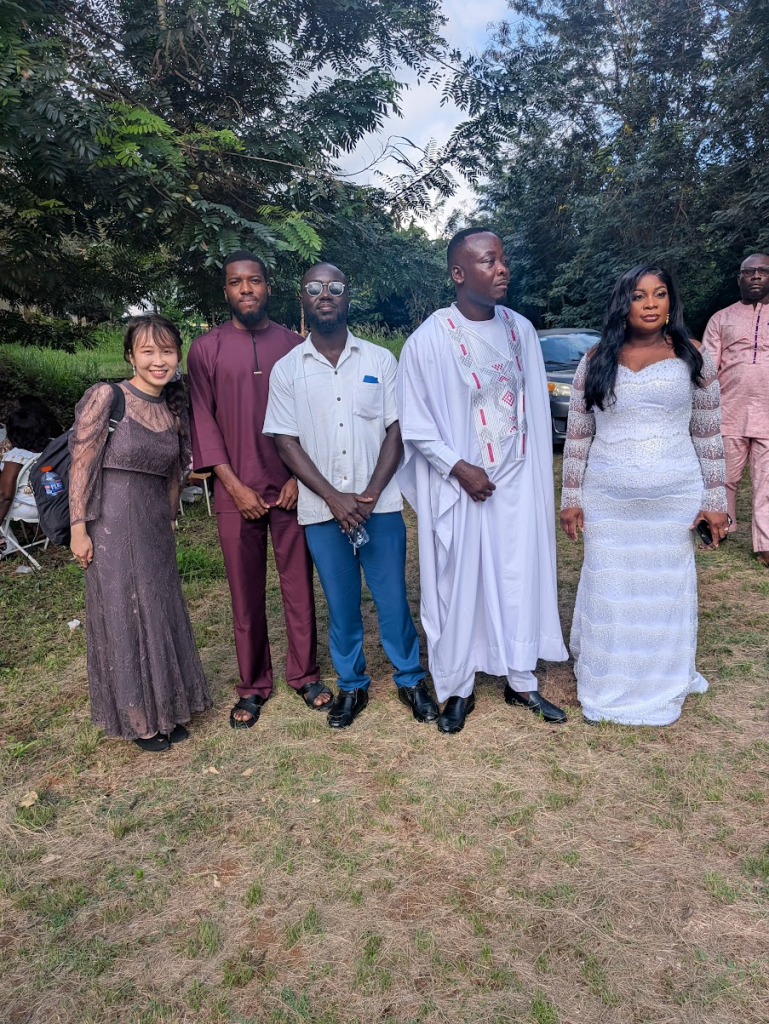 教会の式は1時間もかからずおわり、私たちもレセプション会場に行きました。ごはんはビュッフェ形式で、ガーナ料理のジョロフライスやフフが振舞われました。ケーキカットもありました。