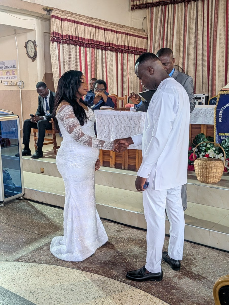 会場から少し離れた教会で、白いウェディングドレスの新婦と、カフタンというガーナの男性が着るオフィシャルな服を着た新郎が入場。牧師さんの言葉を聞き、誓いを立て、結婚証明書にサインします。ウェディングドレスが美しい…!!