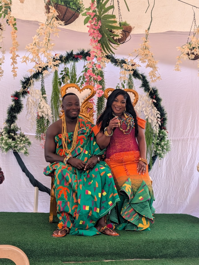 新郎が着ているのはケンテというガーナの伝統的な布です。新婦のドレスの胸とひざ下にも、同じ柄のケンテが使われていてステキです。新郎も新婦も、首や腕にはクロボビーズの大きなネックレス・ブレスレットをつけています。新婦の胸元にもたくさんのクロボビーズがあしらわれていてとてもかわいいです。